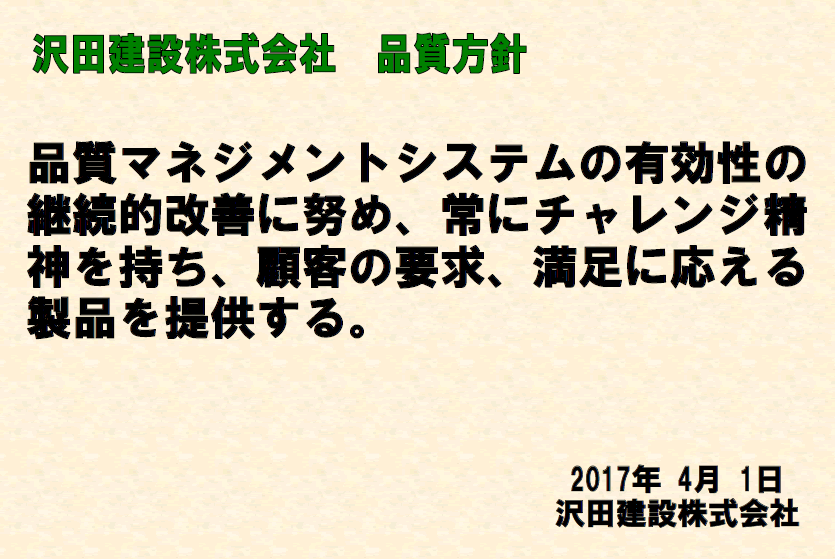 沢田建設株式会社の品質マネジメントシステム JIS Q 9001:2015(ISO 9001:2015)に従って構築した品質マネジメントシステムの包括的な内容を記載し、以下の目的を達成するために定める。