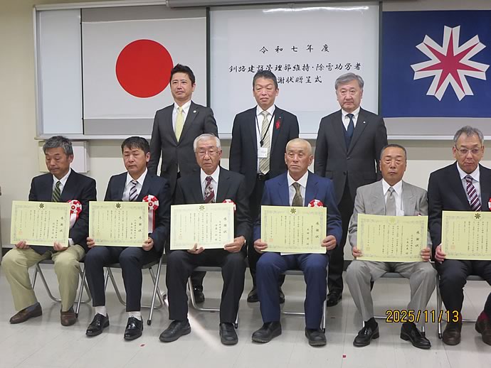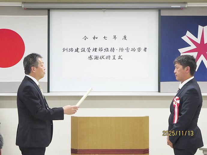 令和7年11月13日「令和7年度・釧路建設管理部維持・除雪功労者感謝状贈呈式」にて、当社職員が授与されました。